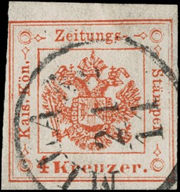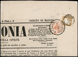 1858 - 1kr nero grigio con ampi margini su 'Il corriere del Brenta' del 4 Settembre 1865 annullato con bollo a [..]