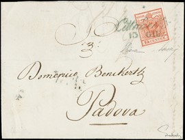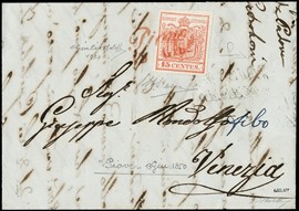 1850 - 15c rosso I tir. da 'PIOVE 13 GIU.' 1850 (Cor rosso) a Venezia. Rarissima impronta. Firme Giulio Bolaffi [..]