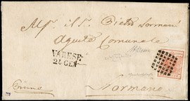 1850 - 15c rosso I tipo annullato con muto a punti di Varese I tipo, da 'VARESE 24 GEN' 1851 a Sormano. Raro. [..]