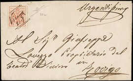 1850 - 15c rosso vermiglio chiaro carta a macchina da 'VICENZA 21-8' (1855) manoscritto, su lettera 'Urgentissima' [..]