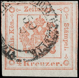 1858 - 4kr rosso smorto, molto ben marginato, con parte di esemplare adiacente. Raro. Firma Em.Diena, CF Ferchenbauer [..]