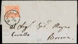 1859 - 5s rosso II tipo da 'BAGNOLO 1/6' (1859) a Brescia. Annullo molto raro in periodo bellico, splendido. CF [..]