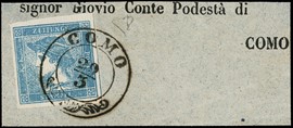 1851 - Mercurio (3cent) cobalto II tipo, su piccolo frammento annullato 'COMO 3/10' (C1). Sigla A.Diena e CF E.Diena [..]