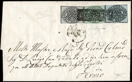 1852 - 1/2 b grigio, coppia verticale al verso di lettera in porto assegnato da 'MONSAMPOLO' (bollo in cartella) [..]