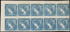 1851 - Mercurio (3 cent) azzurro I tipo, blocco di 10 AdF superiore sinistro, SL. Qualche macchiolina di ruggine, [..]