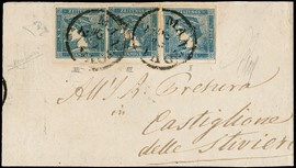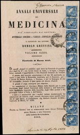 1851 - Mercurio (3 cent) azzurro III tipo striscia di dieci su copertina completa degli 'Annali Universali di [..]