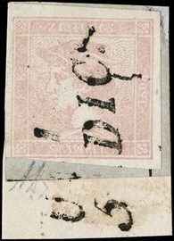 1852 - 15c rosso, III tipo, su carta vergata verticalmente, annullato con parte di bollo riquadrato di Milano [..]