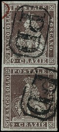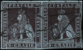 1851 - 9c viola bruno scurissimo su carta azzurra, coppia orizzontale annullata con parti di bollo 'muto a ragno'. [..]