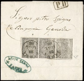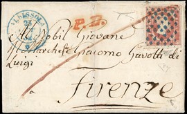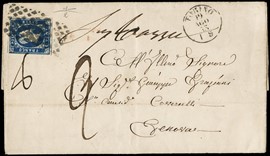 1851 - I emissione, 20c azzurro da “TORINO 19 AGO 1853' a Genova. Lettera tassata a penna “2' e “Sup Tassa' (supplemento [..]