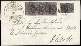1852 - 1/2 b violetto, striscia verticale di tre e singolo da Soriano a Viterbo. Firma Raybaudi, sigla A.Diena, [..]