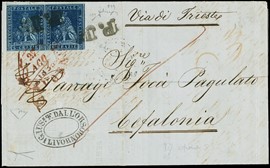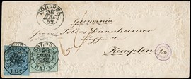 1852 - 1b grigio verdastro e 7b azzurro, su lettera decorata 'Valentina' da 'BOLOGNA 28 DEC 52' per Kempten, Germania. [..]