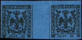 1852 - 40c azzurro scuro senza punto dopo la cifra, coppia orizzontale con interspazio di gruppo e BdF in alto. [..]