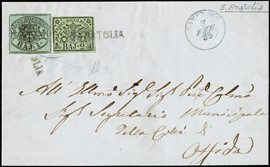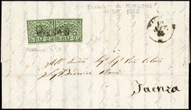 1852 - 2b verde oliva, due esemplari annullati 'FRANCA' (in cartella 'a nastro') da Monte Milone a Faenza. Rarissimo [..]
