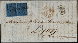 1852 - 40c azzurro coppia, il secondo esemplare ha entrambe le greche larghe, da 'PARMA 6 OTTOBRE.' 1856 per Lyon. [..]