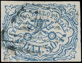 1852 - 50b azzurro oltremare scuro stampa difettosa, ben marginato, annullato con bollo circolare di 'ROMA'. Sigla [..]