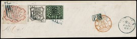 1852 - 2b verde oliva, 8b bianco e 1s rosa carminio, affrancatura 'tricolore', annullati con griglia azzurra su [..]