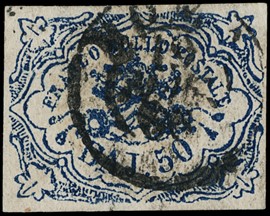 1852 - 50b azzurro annullato a griglia. Sigla Fiecchi, CF A.Diena (Sassone 10 - Euro 3.500)