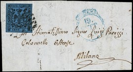 1852 - 40c azzurro con punto dopo la cifra ed errore '4C' anziche' '40', da 'MODENA 19 SETT. 56' a Milano. Splendida. [..]