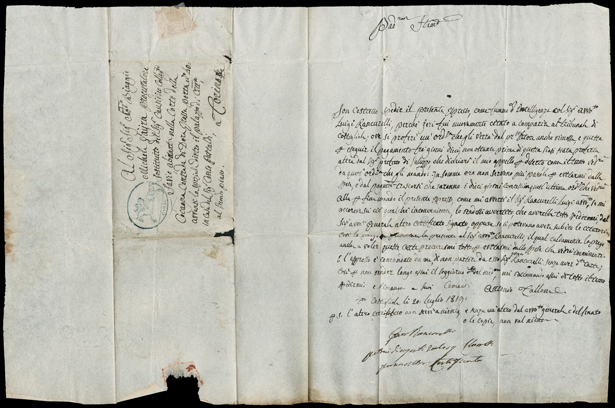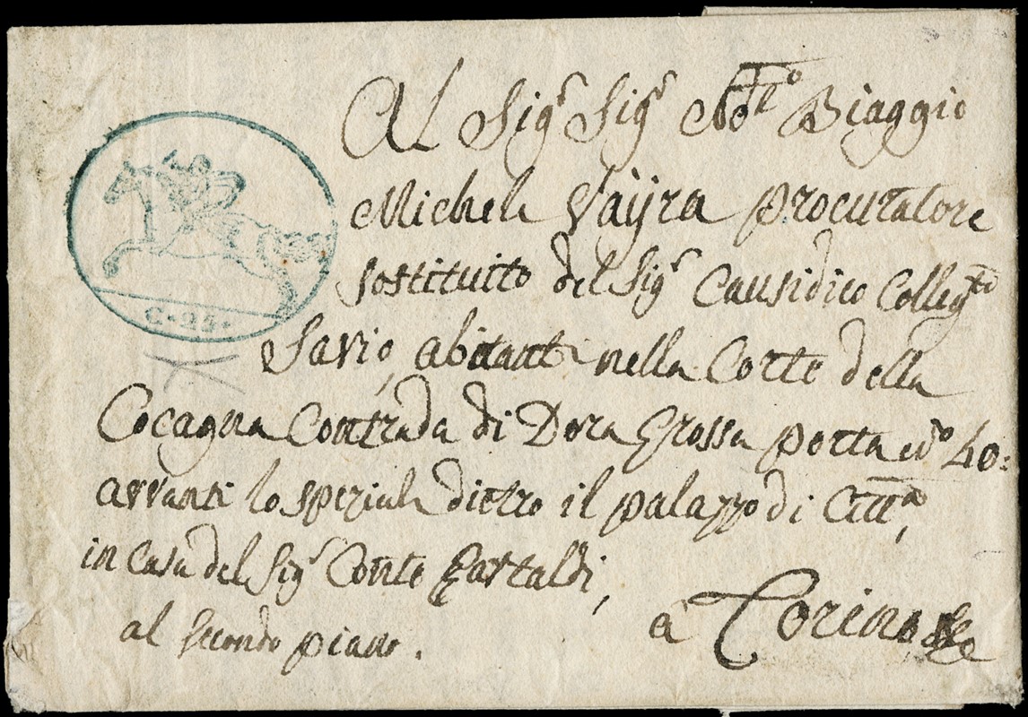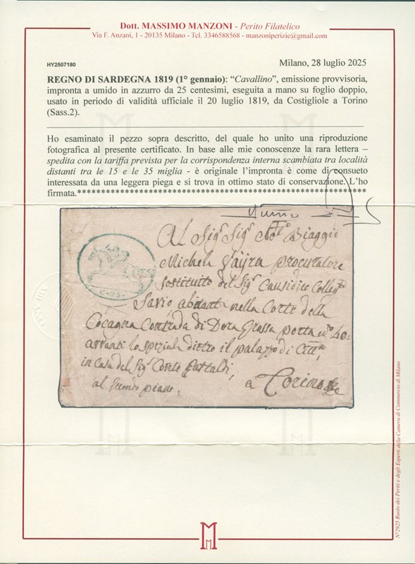 1819 - Provvisoria, 25c azzurro su foglio doppio con leggera piega, da Costigliole a Torino il 20 luglio 1819. Sigla Bottacchi e CF Manzoni (Sassone 2 - Euro 6.000)