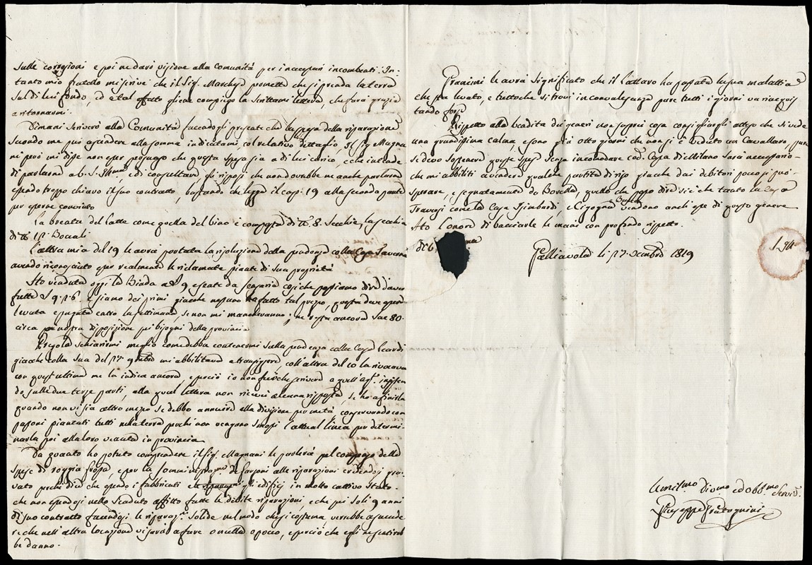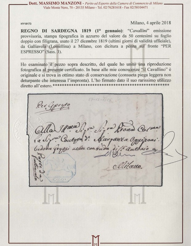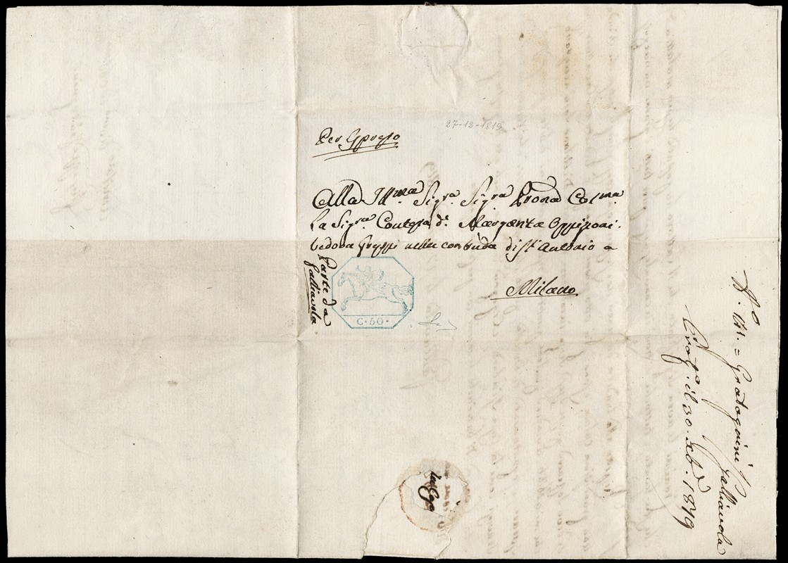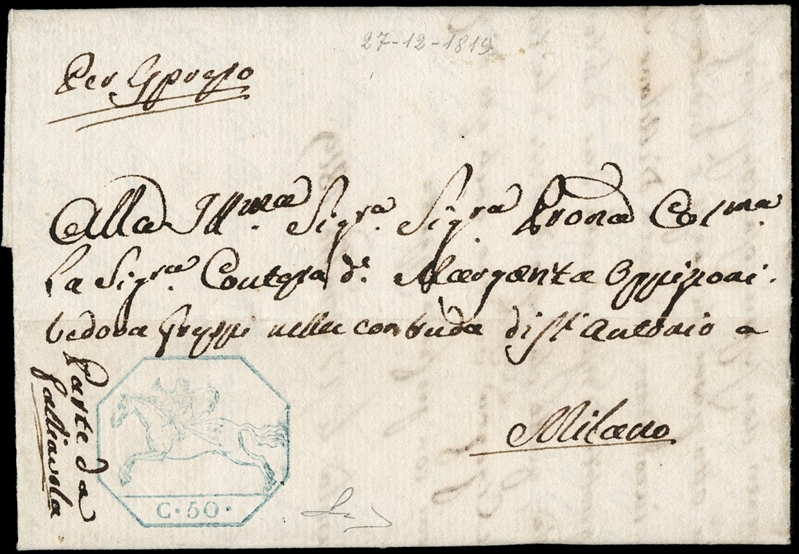 1819 - Provvisoria, 50c azzurro su foglio doppio con leggera piega, da Galliavola a Milano il 27 dicembre 1819. Rarissimo l'uso dei 'Cavallini' per l'estero. CF Manzoni (Sassone 3 - Euro 20.000++)