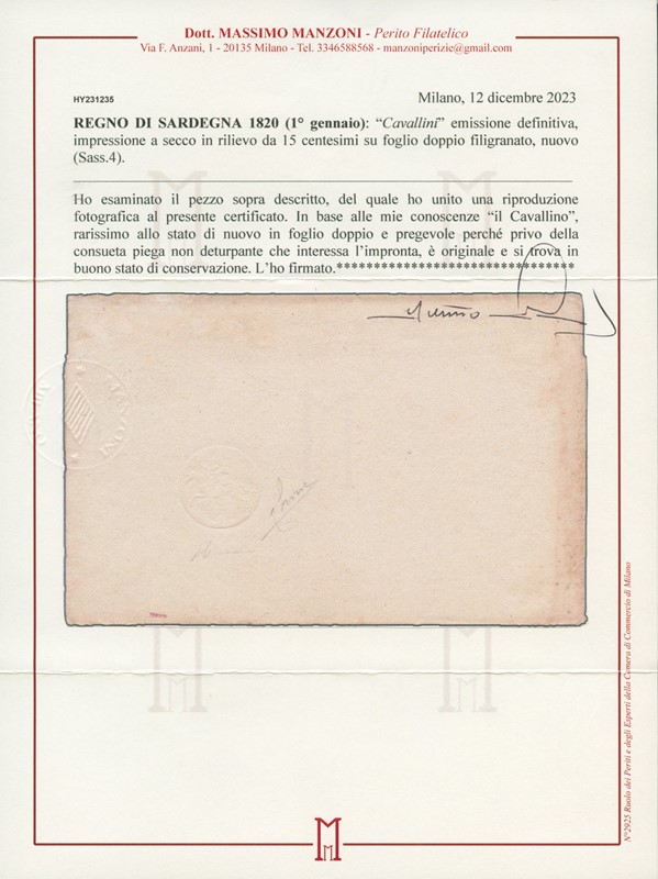 1820 - Definitiva, 15c su foglio doppio nuovo. CF Manzoni (Sassone 4 - Euro 20.000+)