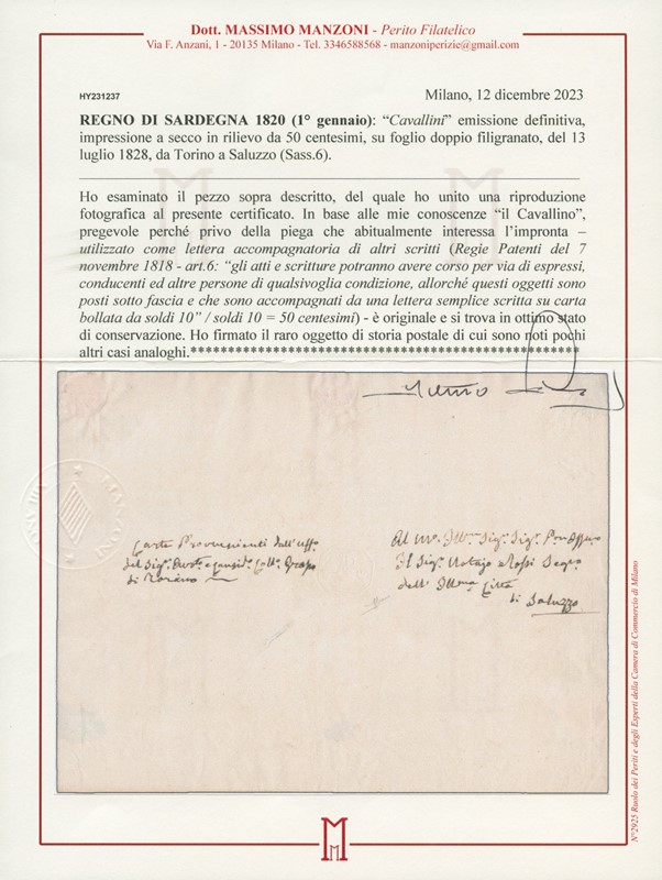 1820 - Definitiva, 50c su doppio foglio senza piega utilizzato come lettera accompagnatoria di altri scritti. Molto raro, pochi casi noti. Firma Sorani, CF Manzoni (Sassone 6 - Euro 32.000+)