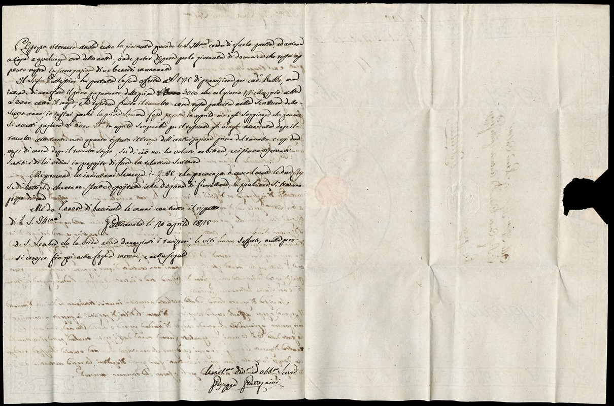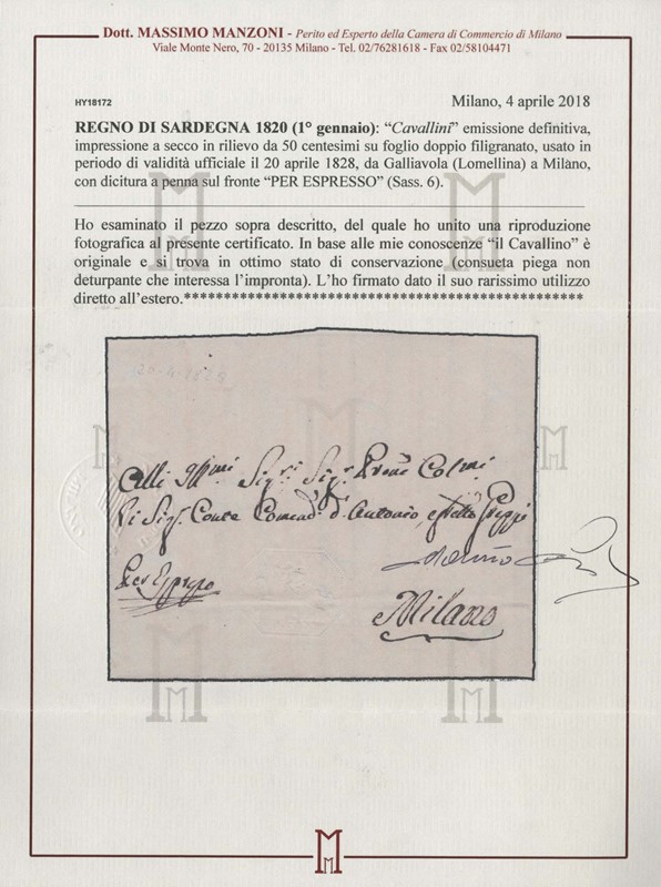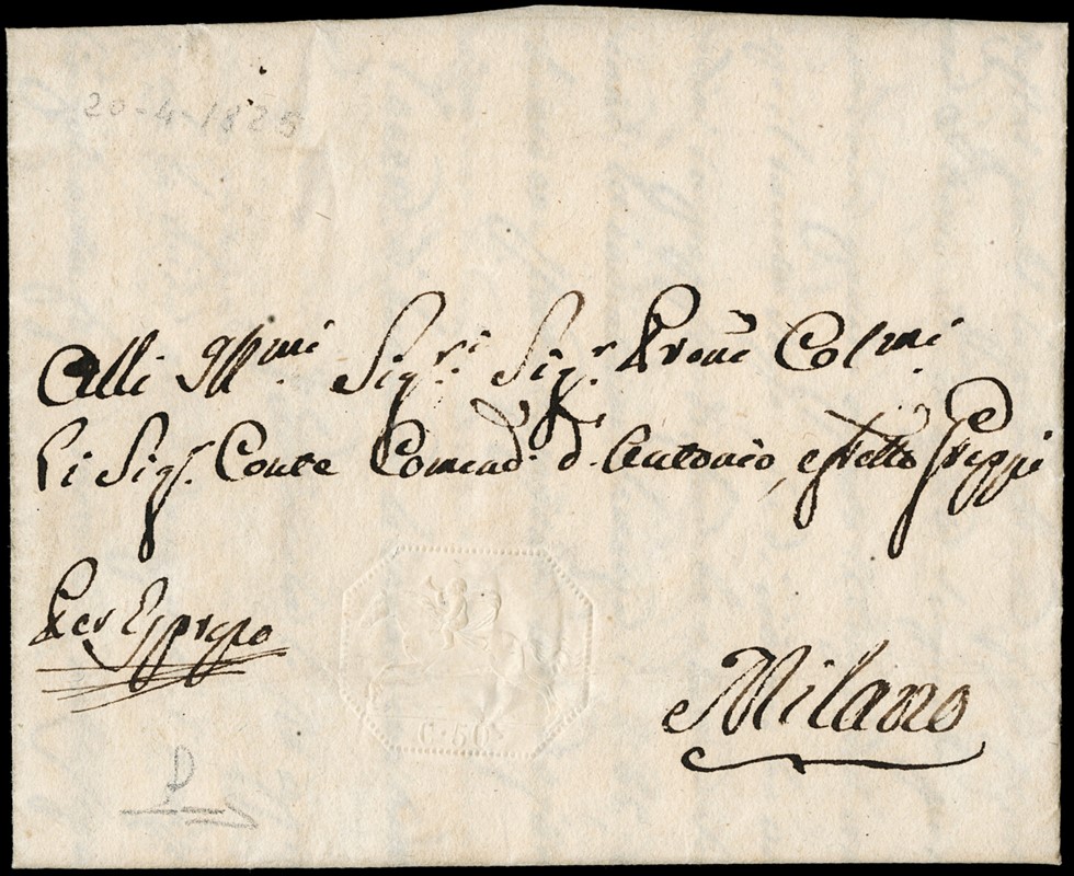 1820 - Definitiva, 50c su foglio doppio con leggera piega, da Galliavola a Milano il 20 aprile 1828. Rarissimo l'uso dei 'Cavallini' per l'estero. CF Manzoni (Sassone 6 - Euro 24.000+)