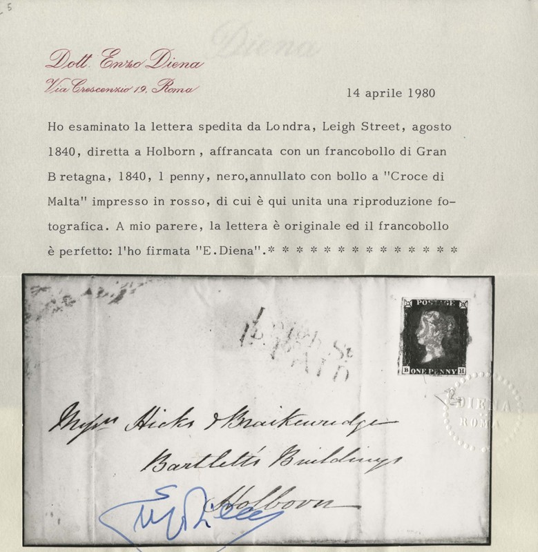 1840 - Gran Bretagna: 1d nero 'Penny Black', pos.B-H, annullato con croce di Malta rossa da 'LONDON LEIGH ST.' per Holborn, nell'agosto 1840. CF E.Diena (SG 1 - GBP 750)