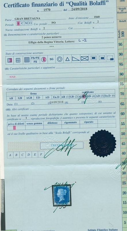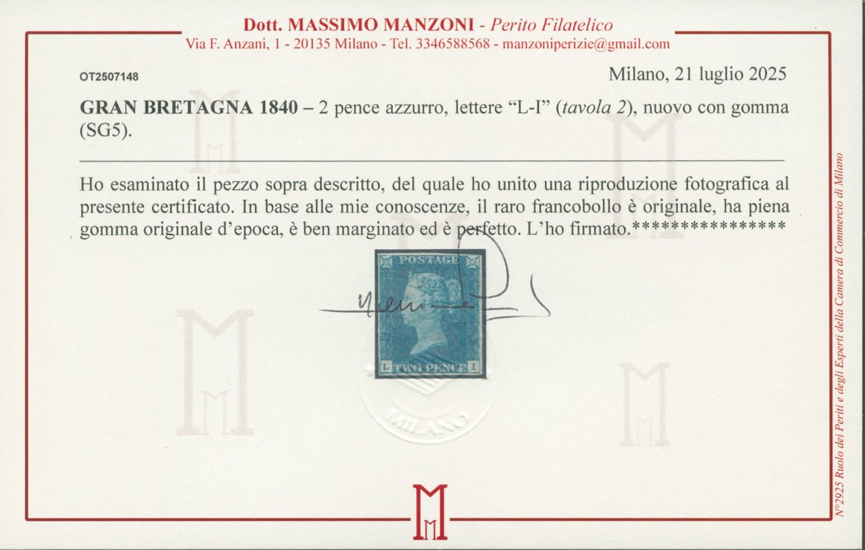 1840 - Gran Bretagna: 2d azzurro, pos.L-I, quattro margini bianchi, nuovo con gomma. CF Bolaffi e Manzoni (SG 5 - GBP 48.000)