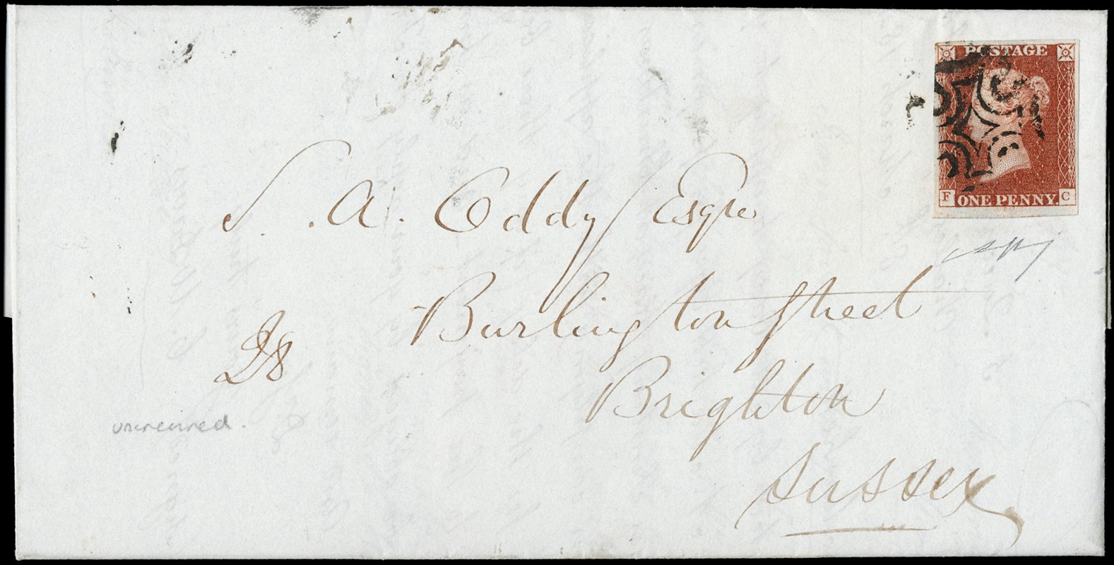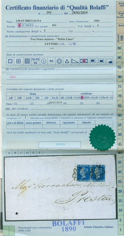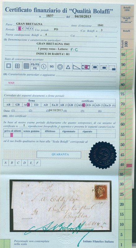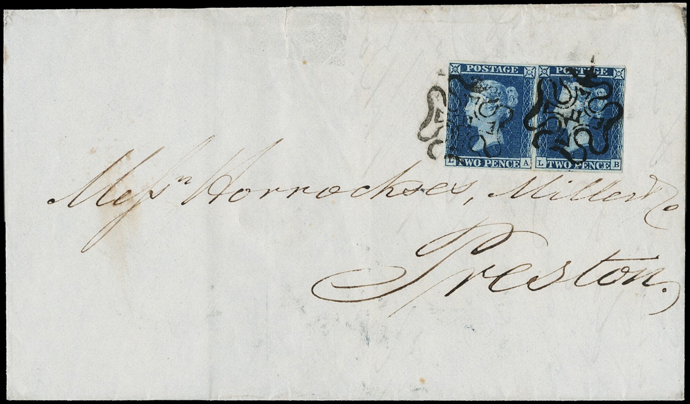 1841 - Gran Bretagna: 1d rosso 'Penny Red', pos.F-C, da Hoxton per Brighton, 9 marzo 1843, e 2d azzurro 'White Lines', coppia pos. L-A e L-B annullata con croce di malta con numero '11' al centro, per Preston. Due CF Bolaffi (SG 7, 13 - GBP 1.550+)