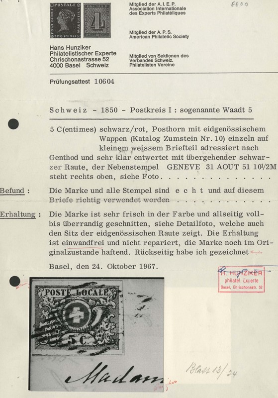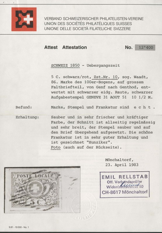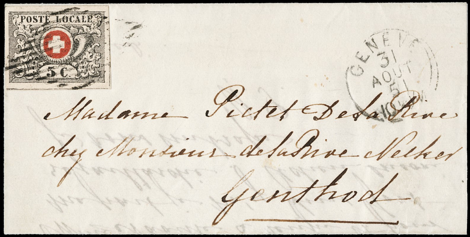 1849 - GINEVRA: 5c nero intenso e rosso, da 'GENEVE 31 AOUT 51' a Genthod. CF Hunziker e Rellstab (Zumstein 10a - CHF 4.500)