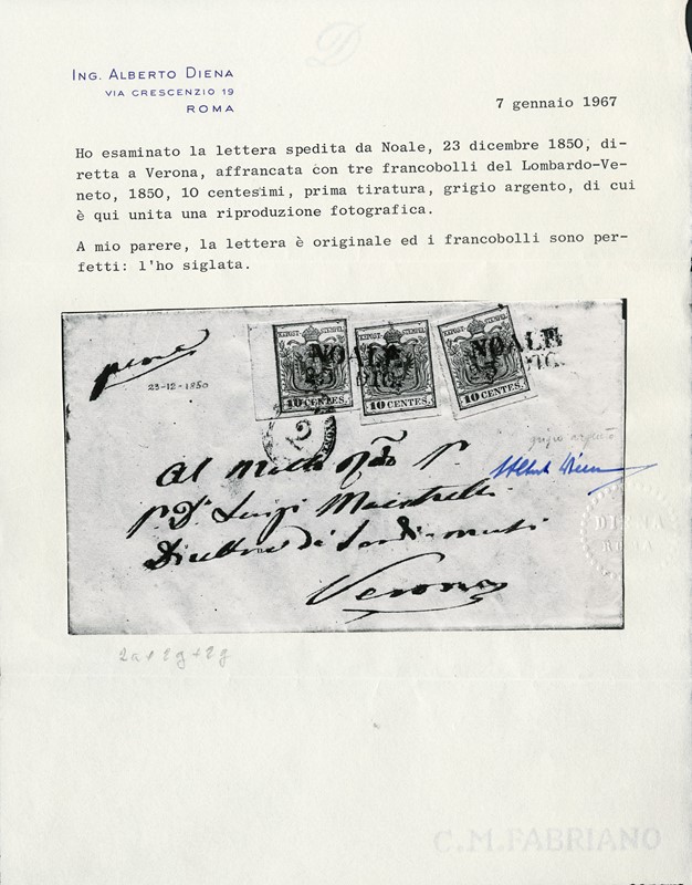 1850 - 10c grigio argenteo, I tir., tre esemplari di cui 1 BdF da 'NOALE 23 DIC.' 1850 a Verona. Firme Giulio Bolaffi, Alberto ed E.Diena, CF Manzoni (Sassone 2a - Euro 22.500+)