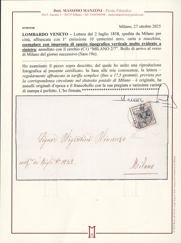 1850 - 10c nero carta a macchina con spazio tipografico verticale molto evidente a sinistra, da 'MILANO 2 LUG' 1858 per citta'. CF E.Diena (Sassone 19e - Euro 18.500 come usato)