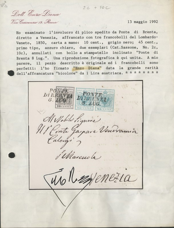 1850 - 10c nero e 2 esemplari di 45c azzurro chiaro I tipo, tutti tirature antiche, da 'PONTE DI BRENTA 8. LUG' a Venezia. Lettera mancante di un 5c probabilmente caduto o tolto. CF E.Diena (Sassone 2+10 - Euro 2.500+ come FR)