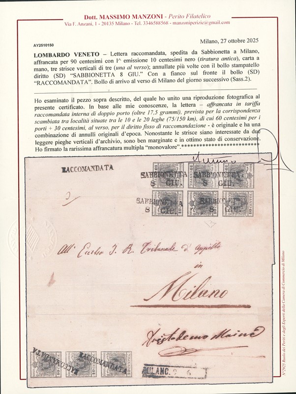1850 - 10c nero (tiratura antica), tre ST3, delle quali due al recto e una al verso di 'RACCOMANDATA' da 'SABBIONETTA 8 GIU.' per 'MILANO. 9-6'. Alcune pieghe d'archivio verticali, che nulla tolgono al fascino di questa affrancatura. CF E.Diena (copia) (S