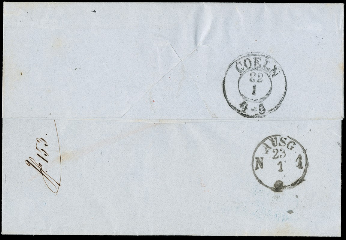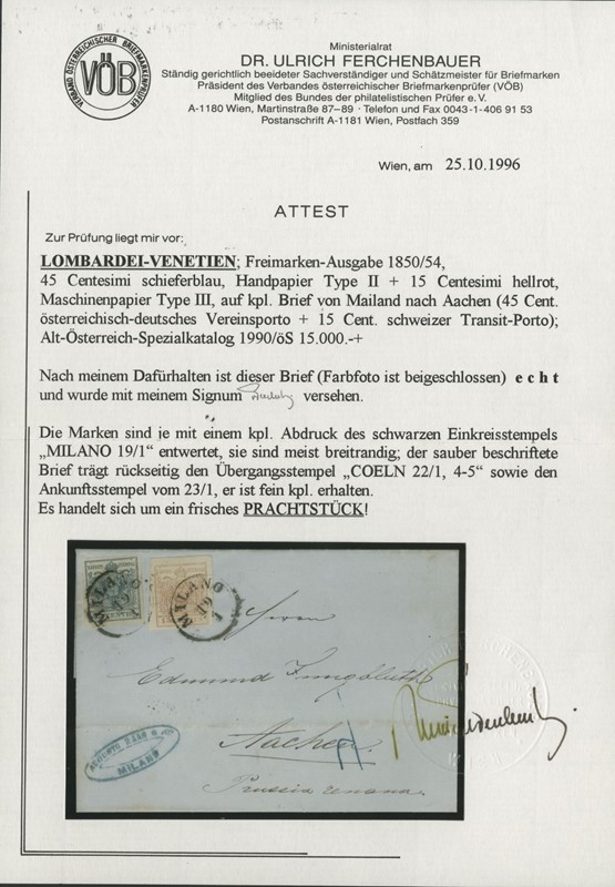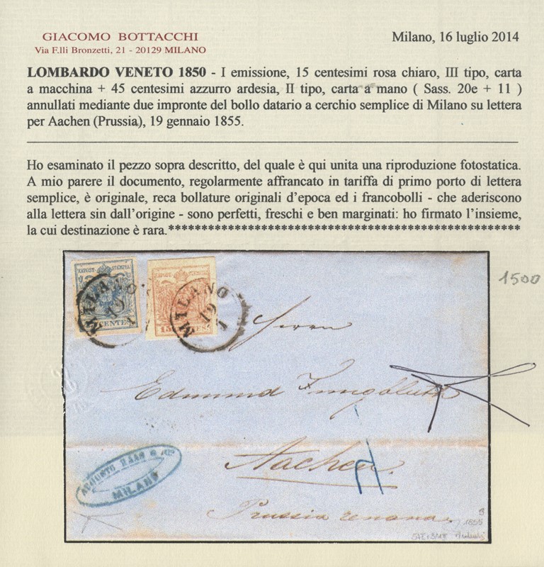 1850 - 15c rosa chiaro III tipo, carta a macchina, e 45c azzurro ardesia II tipo carta a mano, da 'MILANO 19/1' ad Aachen (Stati Tedeschi). Splendida, rara destinazione. CF Bottacchi e Ferchenbauer (Sassone 11+20e - Euro 3.250++)