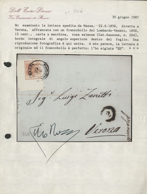 1850 - 15c rosa salmone carta a macchina AdF superiore destro 8x13mm da 'MASSA 22/6' a Verona. CF E.Diena (Sassone 20d - Euro -)