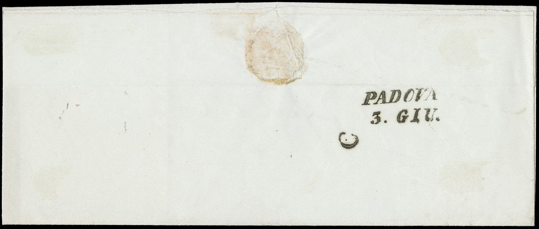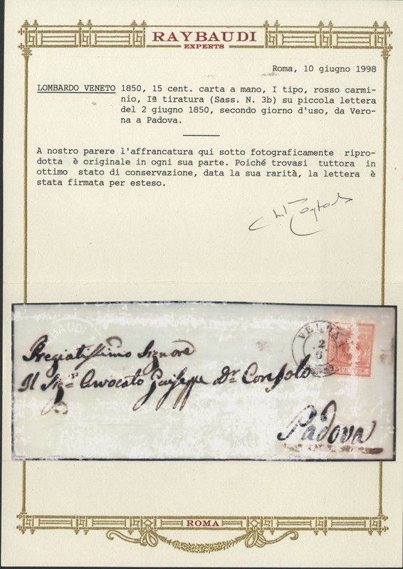 1850 - 15c rosso carminio I tir. da 'VERONA 2/6' (1850) a Padova. Secondo giorno d'uso. Splendida. CF Raybaudi (Sassone 3b - Euro 10.000)