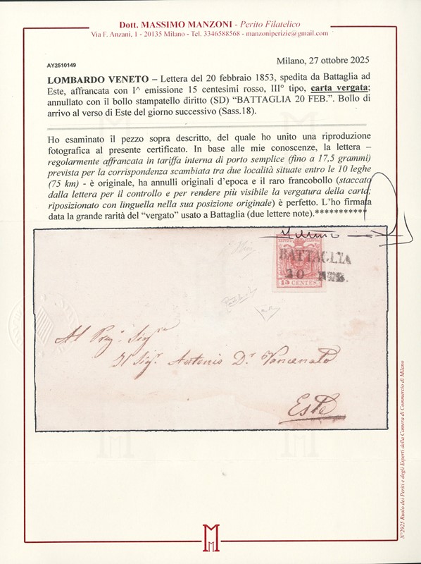 1850 - 15c rosso carta vergata da 'BATTAGLIA 20 FEB.' (53) a Este. Una delle due lettere note con il vergato usato a Battaglia. Per rendere piu' visibile la caratteristica carta vergata, il francobollo, freschissimo e con grandi margini, e' stato staccato dalla lettera e riapplicato con una linguella. Firma Mondolfo, CF E.Diena, Oliva e due CF A.Diena (Sassone 18 - Euro 180.000)