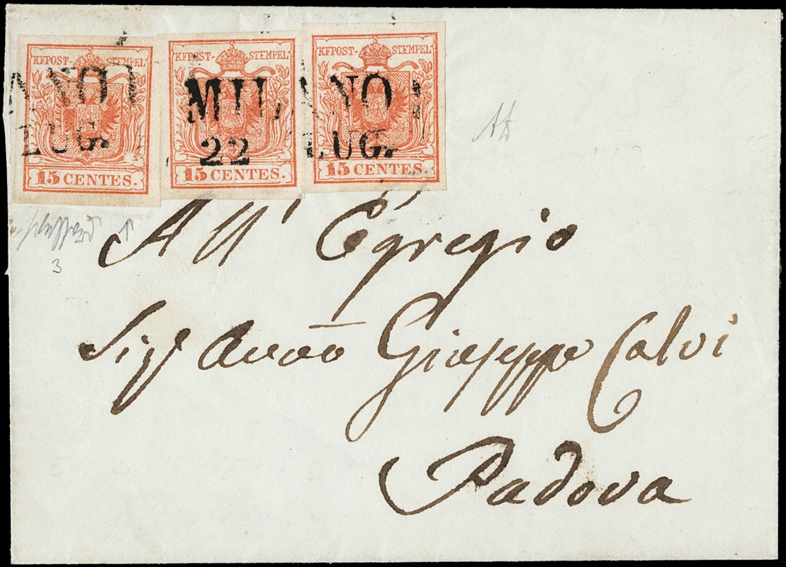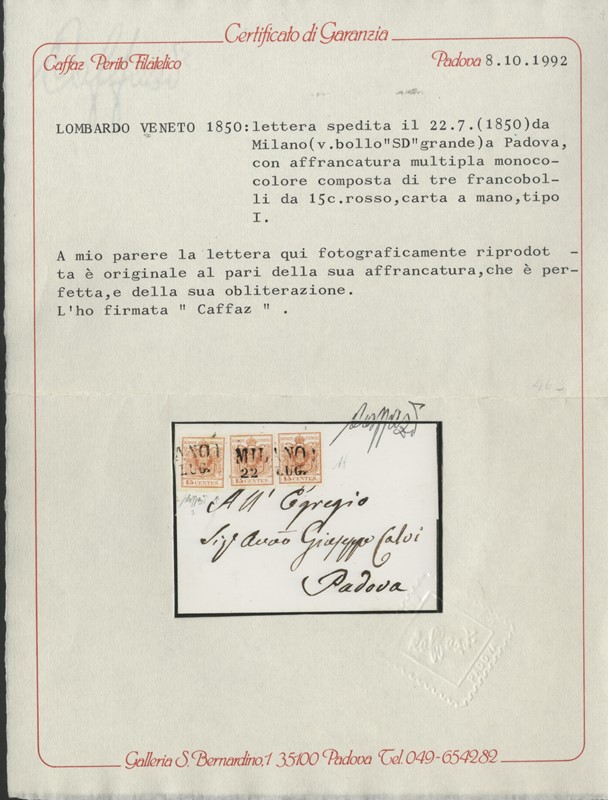 1850 - 15c rosso, I tipo, tre esemplari da 'MILANO 22 LUG' (SD) a Padova. Sigla A.Diena, CF Caffaz (Sassone 3+pt.6 Euro 1480)