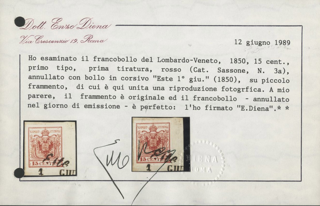 1850 - 15c rosso I tir. annullato 'ESTE 1 GIU' su frammento. Primo giorno d'uso dei francobolli di Lombardo Veneto. Firme A.Diena e Giulio Bolaffi, CF E.Diena (Sassone 3a - Euro 7.500)
