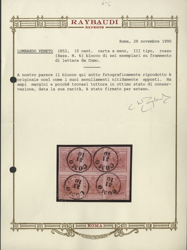 1850 - 15c rosso III tipo BL6 annullato 'Como 31/10'. Firme A.Diena e Oliva, CF Raybaudi (Sassone 6 - Euro 15.750+)