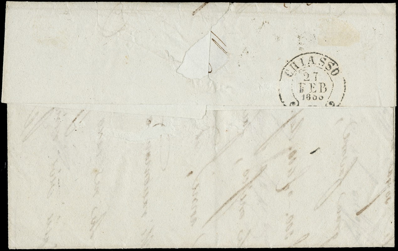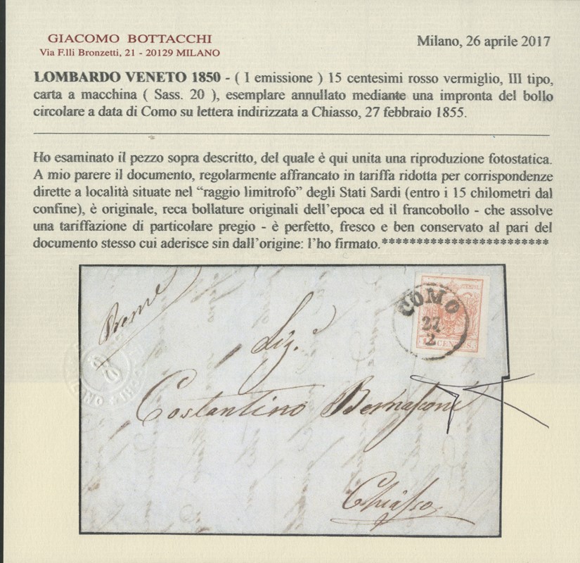 1850 - 15c rosso vermiglio carta a macchina da 'COMO 27/2' (1855) a Chiasso. Tariffa ridotta per corrispondenze di raggio limitrofo (entro 15km dal confine). CF Bottacchi (Sassone 20 - Euro -)