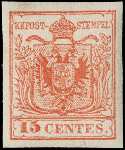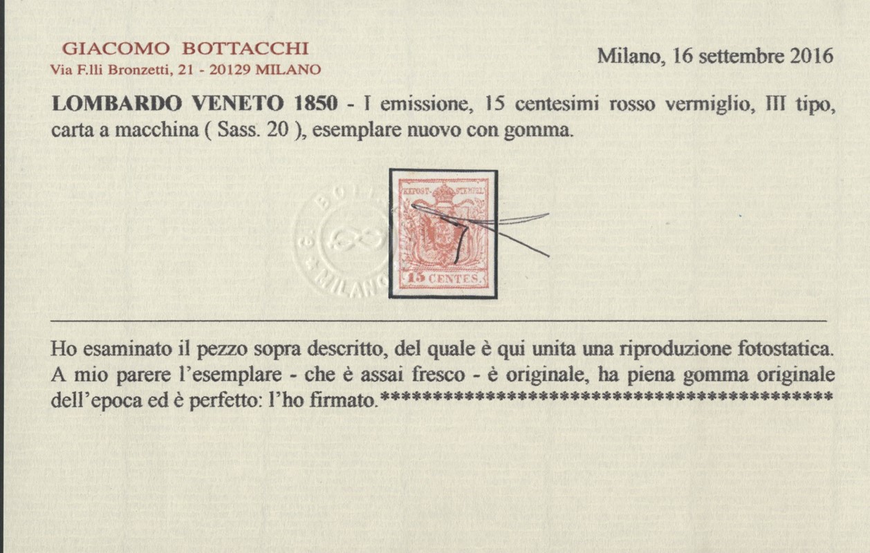 1850 - 15c rosso vermiglio, III tipo, carta a macchina, nuovo con gomma. Sigla A.Diena, CF Bottacchi (Sassone 20 - Euro 5.000)