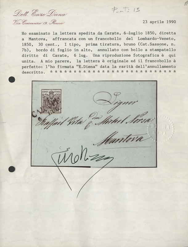 1850 - 30c bruno I tipo I tir. BdF da 'CARATE 6 LUG' 1850 (SD) a Mantova. CF E.Diena (Sassone 7b+pt.13 - Euro 12.000++)