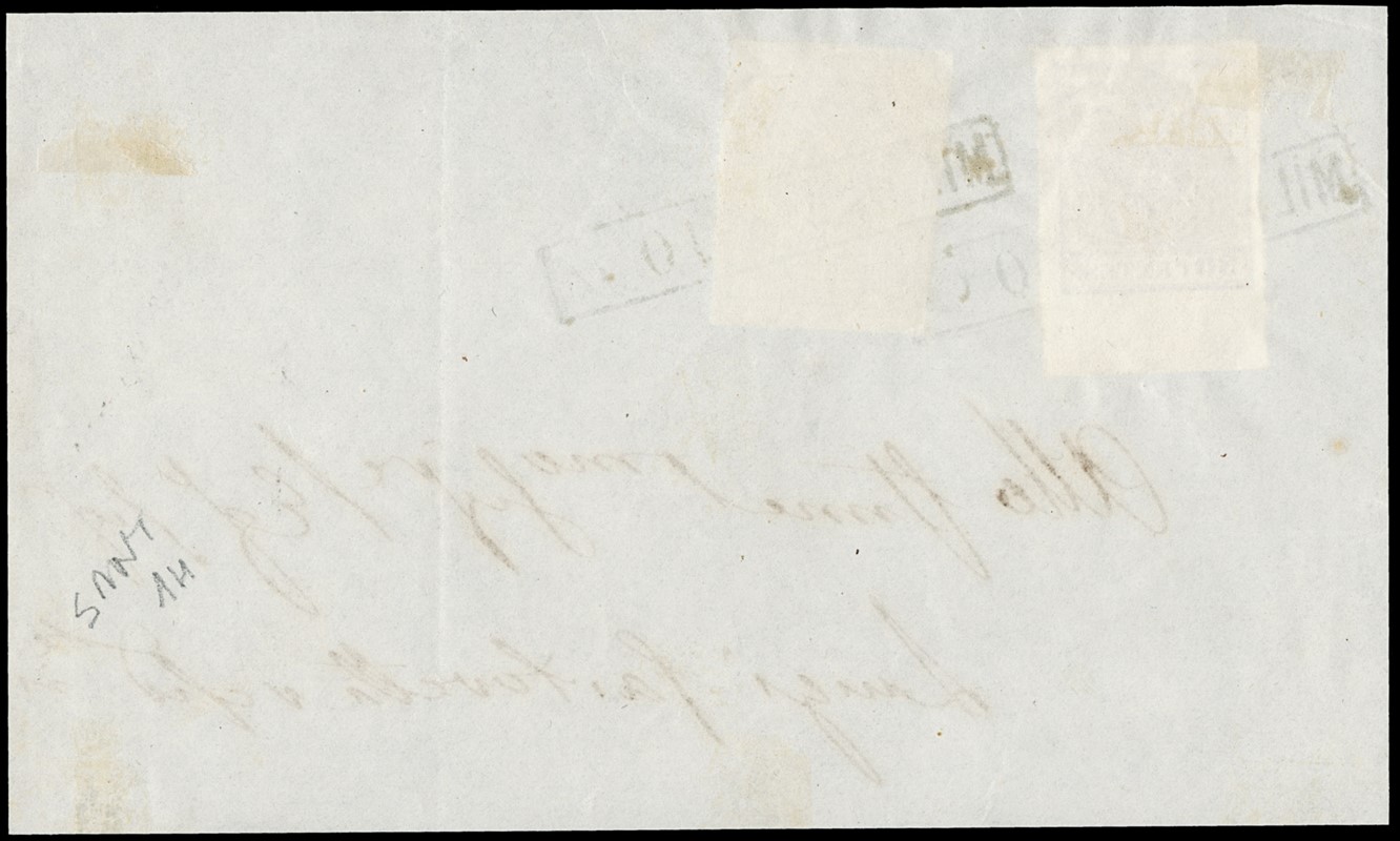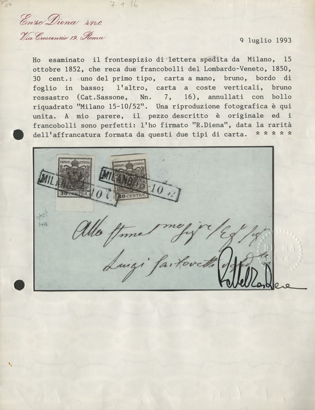 1850 - 30c bruno rossastro I tipo BdF in basso e 30c bruno rossastro costolato su gran parte di frontespizio da 'MILANO 5-10 | 52'. CF E.Diena (Sassone 7f+16aa - Euro -)