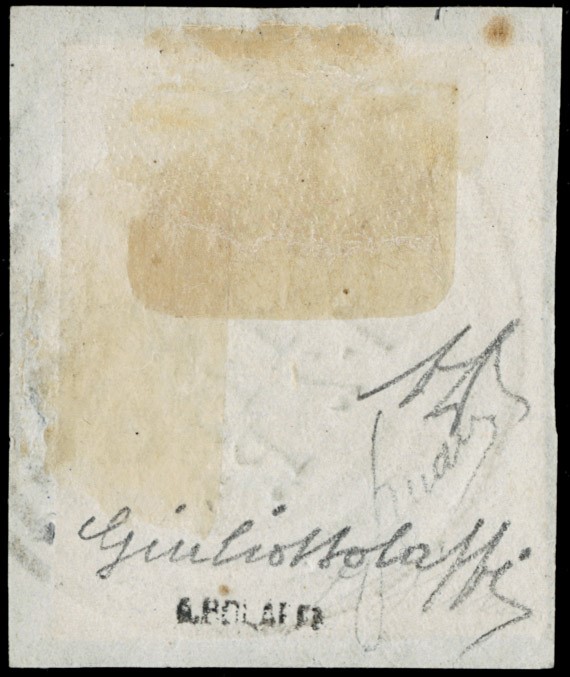 1850 - 45c azzurro chiaro I tipo con una grande mancanza di stampa, '4' al posto di '45' centes. Spettacolare, Firma G.Bolaffi, CF A.Diena (Sassone 10c - Euro -)