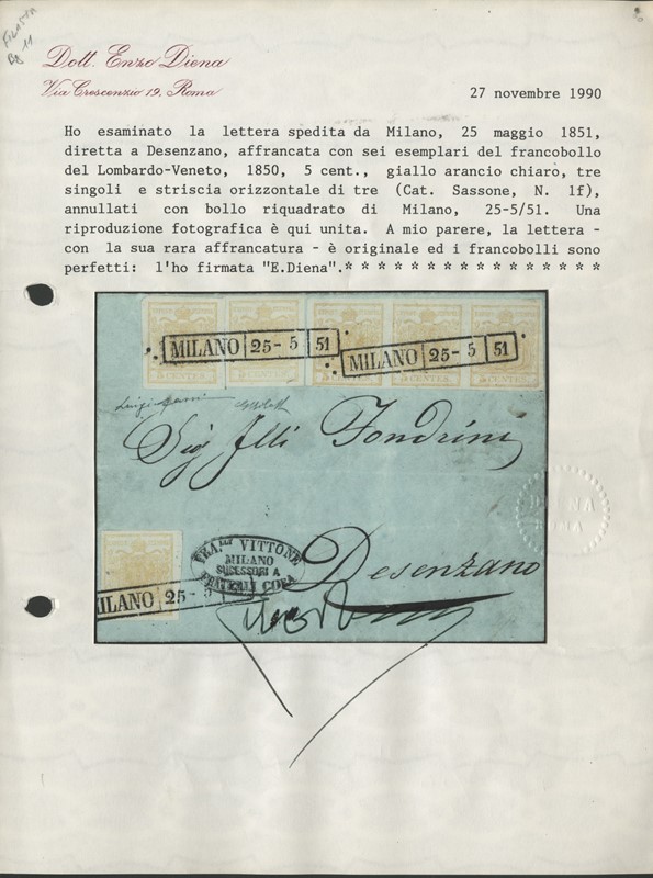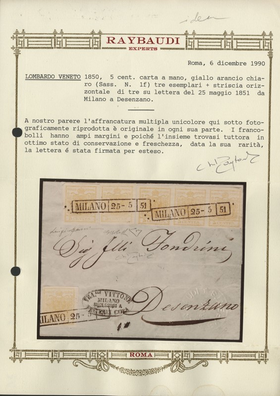 1850 - 5c giallo arancio chiaro, tre esemplari e striscia di tre da 'MILANO 25-5 51' a Desenzano. Firma Giulio Bolaffi, CF E.Diena e Raybaudi (Sassone 1f - Euro 18.500+)