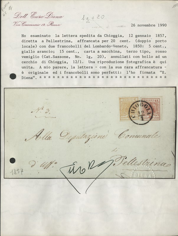 1850 - 5c giallo arancio e 15c rosso vermiglio (carta a macchina) da 'CHIOGGIA 12/1' 1957 a Pellestrina, in tariffa di doppio porto per il circondario. CF E.Diena (Sassone 1g+20 - Euro -)