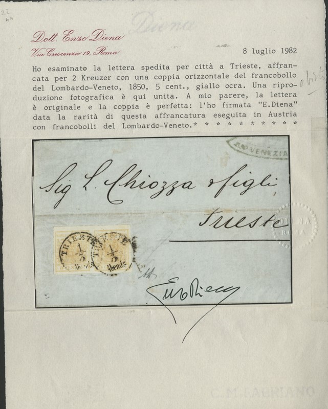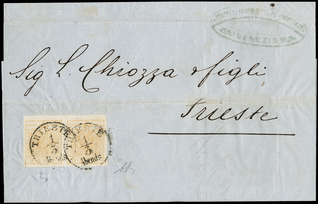1850 - 5c giallo bistro, coppia orizzontale da 'TRIESTE 1/3' (1858) per citta'. Rarissimo uso dei francobolli di Lombardo Veneto in Austria. Sigla A.Diena e CF E.Diena (Sassone 1k - Euro 40.000+)